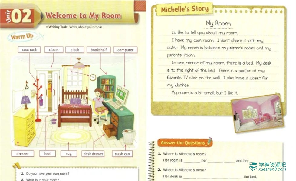 第一部分帮助学生理解话题,对话题产生兴趣,也会介绍一些新的单词。用基础的问题提问,让学生对该话题产生感悟和讨论。给出范文让学生对于自己的作文有一个大体的样板。针对范文用问题检测学生是否理解了文章。