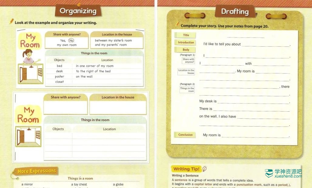 让学生理解作文结构,开始组织他们自己的作文。提供一些学生在作文中可以使用的其他表达。第一份草稿是根据已经给出的结构和信息来动笔。