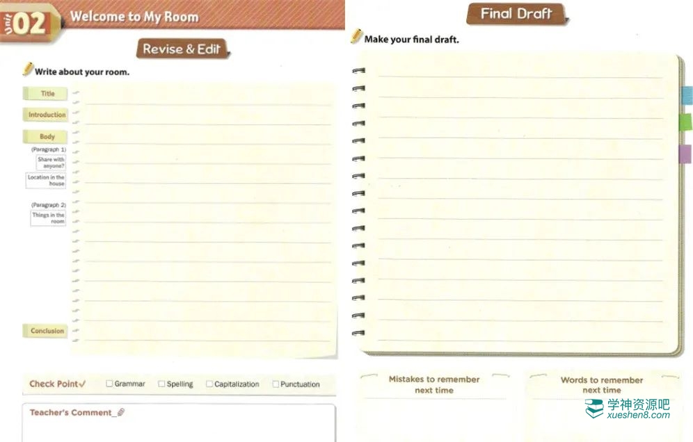 脱离模板,写下完整的作文。写完后试着去查找语法、拼写、标点符号的错误。修改完作文后再次誊写,成为最终的定稿。学生记下核心词汇,以及错误点避免以后再发生。
