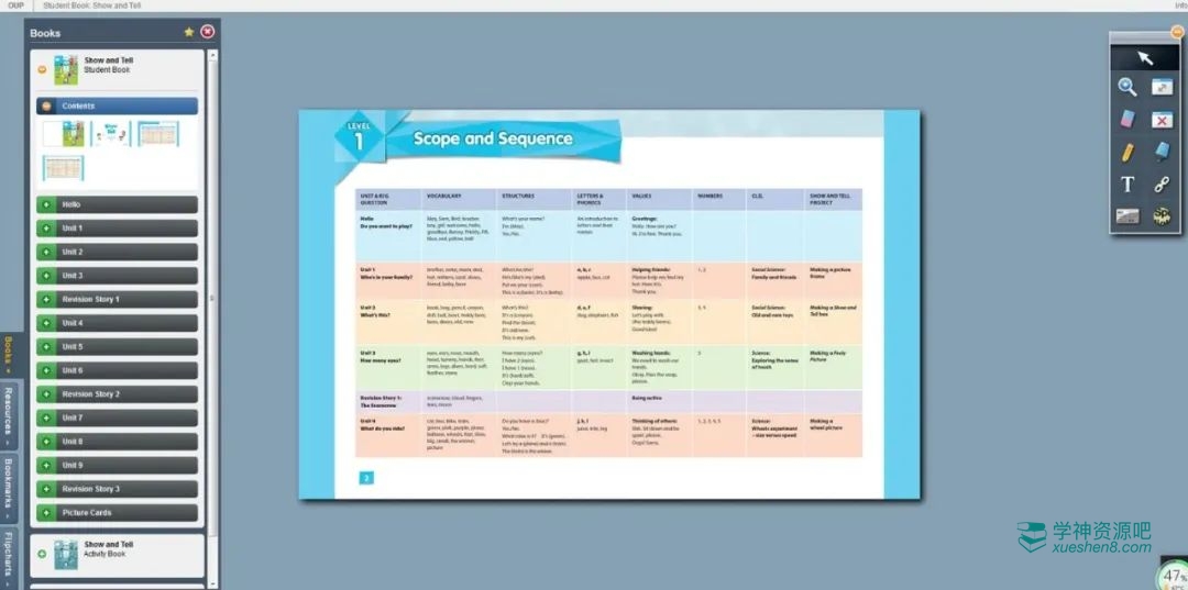 本套教材共分为3个级别,每个级别分为9个独立单元(每个单元10页),三个复述故事。含学生用书,练习册,音频,视频等。(电子白板还没找到,收集到后更新)