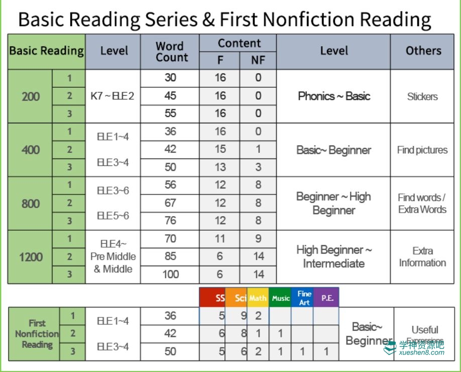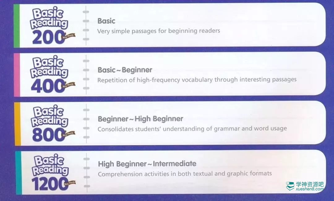 Basic Reading 系列以阅读常用字为基础,在单词基础上拓展出句型及简单的阅读。从易到难,累积阅读量。它是一套完整的教材,通过短句,故事,场景和上下文来学习词汇,从非常简单的词汇入手,逐步提高阅读理解的能力。