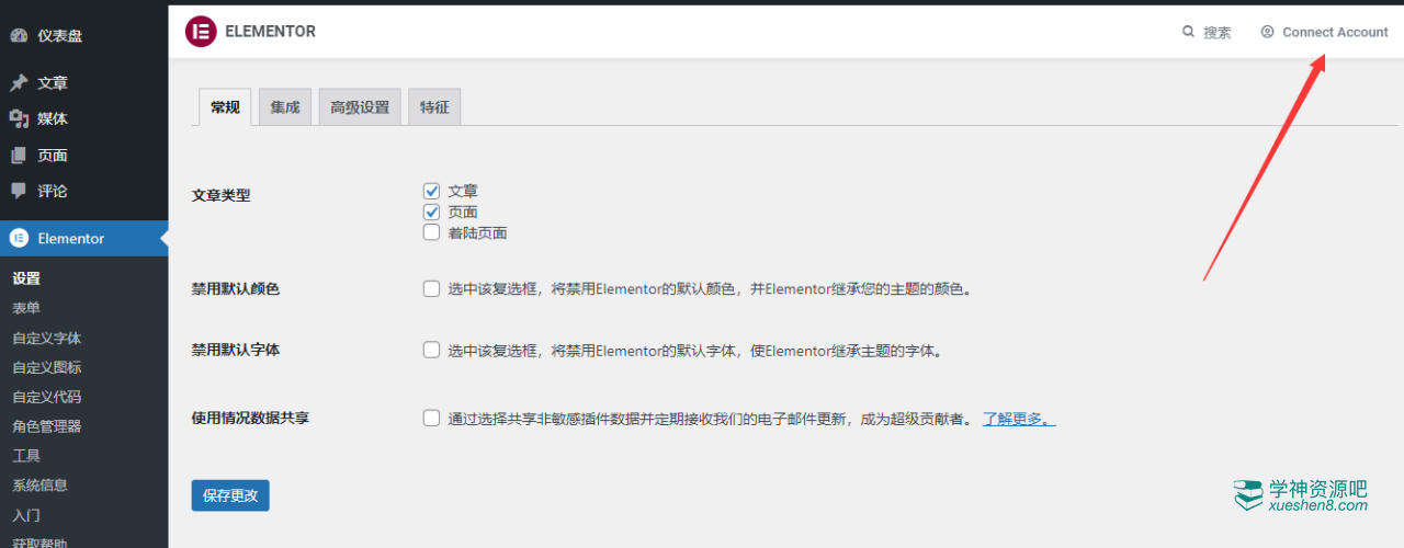 跳过向导回到WordPress仪表盘,可以看到Elementor和Template菜单,Elementor基础插件已经安装完成。