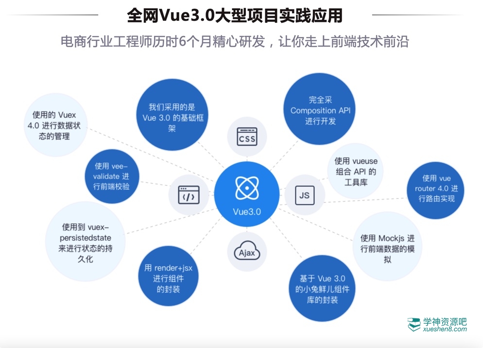 课程核心是Vue3.0的学习以及在企业级项目中的运用,同时还原企业级电商项目的开发过程。