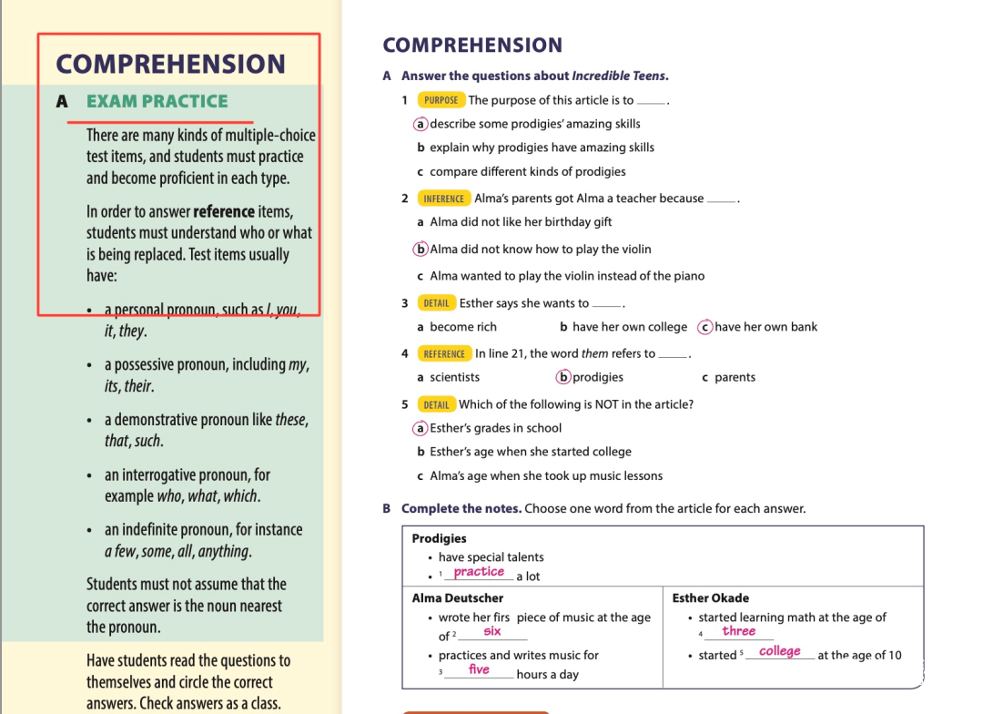 (1)教材中的练习出现跟小托福考试题型一致时,Time Zones第三版的教师用书中会进行考试题型(Exam Practice)提醒说明,以第二级别,阅读理解板块的样张为例,展示如下: