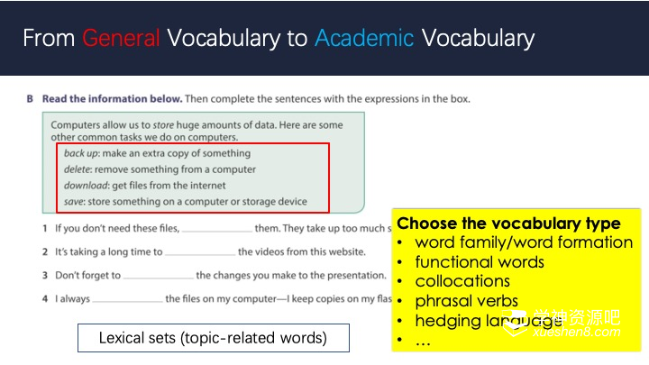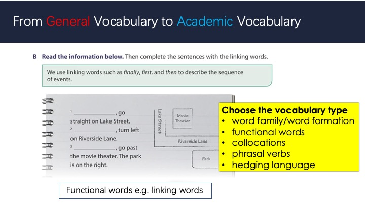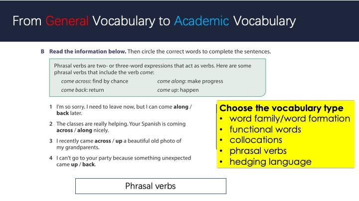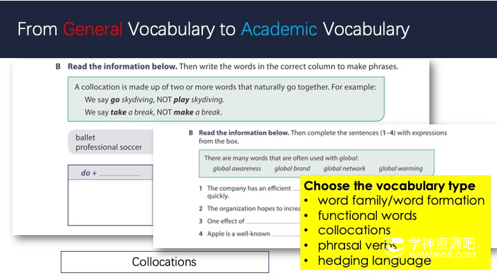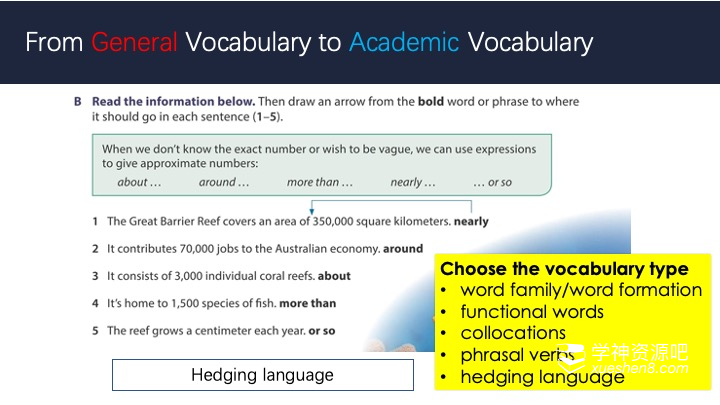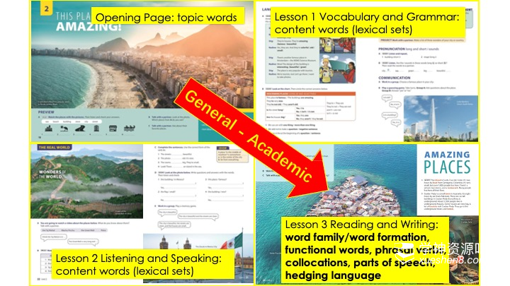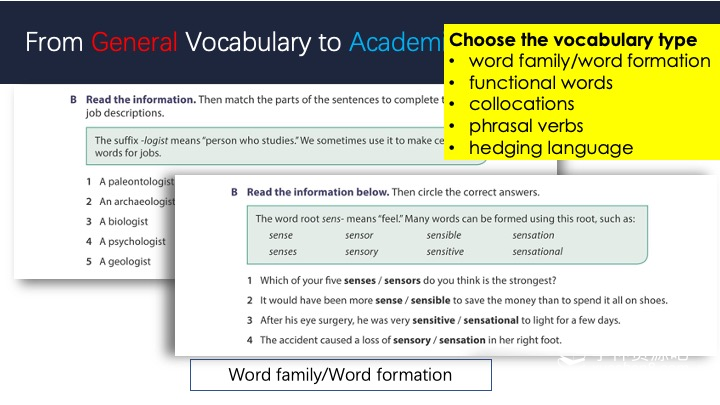 Time Zones第三版通过真实世界的内容衔接跨越全学科,使用CLIL(语言和内容融合学习)以及TBLT(任务式教学法),涵盖了通用英语以及学术英语内容,完美对接小托福要求,例如通过阅读和写作的任务,对通用词汇、学科词汇、学术词汇全方位练习,其中包含: