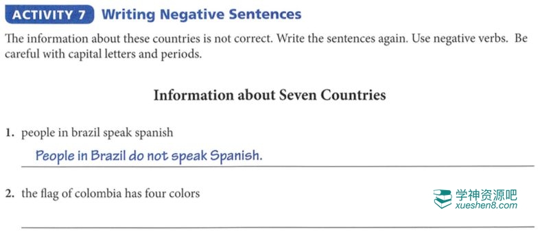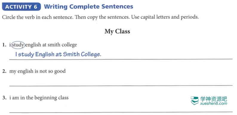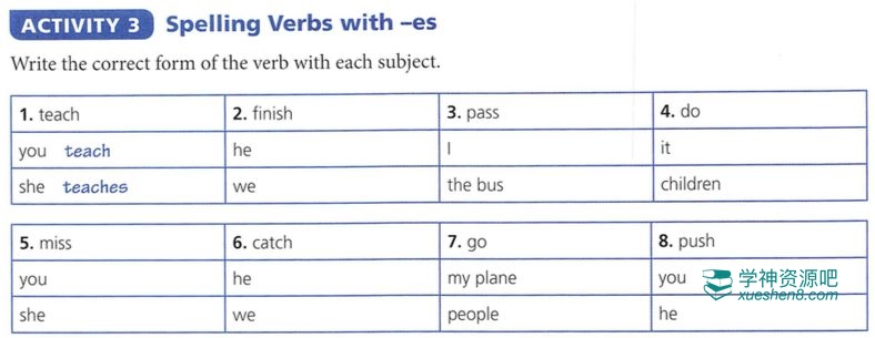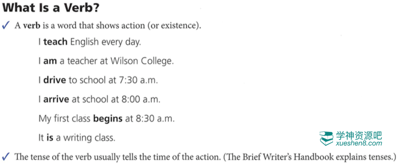 比如三单元是关于一般现在时的句子的写作。这单元的语法重点是关于动词的使用。首先从什么是动词开始,
