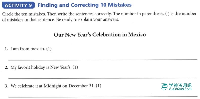 句子改错练习的难度明显增加。其中既有大小写,标点符号这些基本的错误,也有介词使用不当这些不太容易发现的错误。