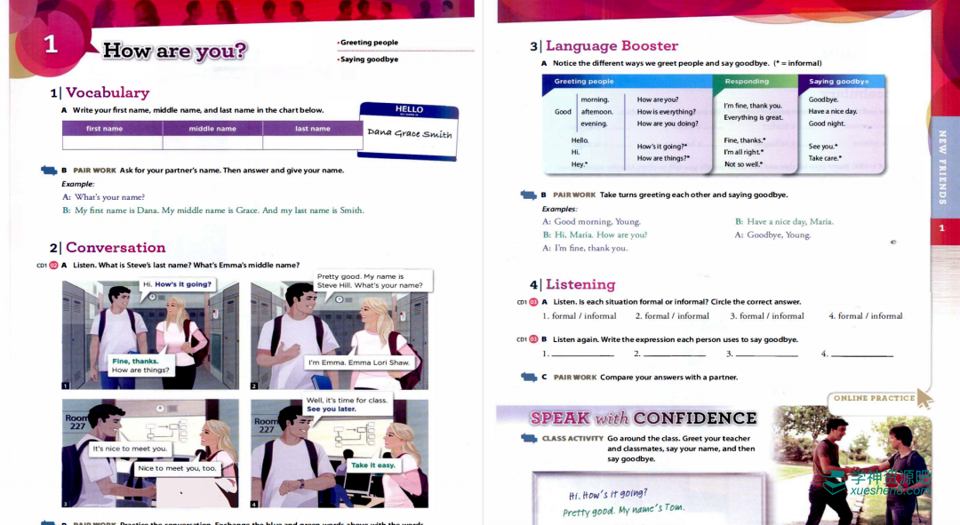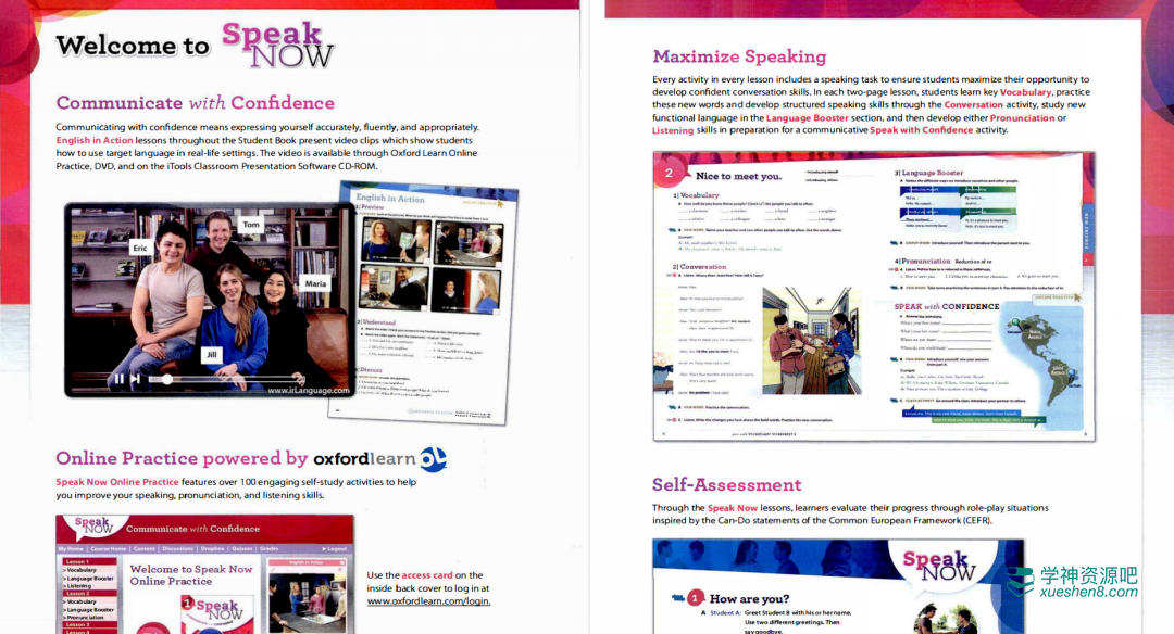 Speak Now旨在培养学生的英语沟通能力,让他们能够自信、有效地与人沟通。每两页为一课,配有清晰的范例,以个人化的方式帮助学生练习实用的日常生活用语。